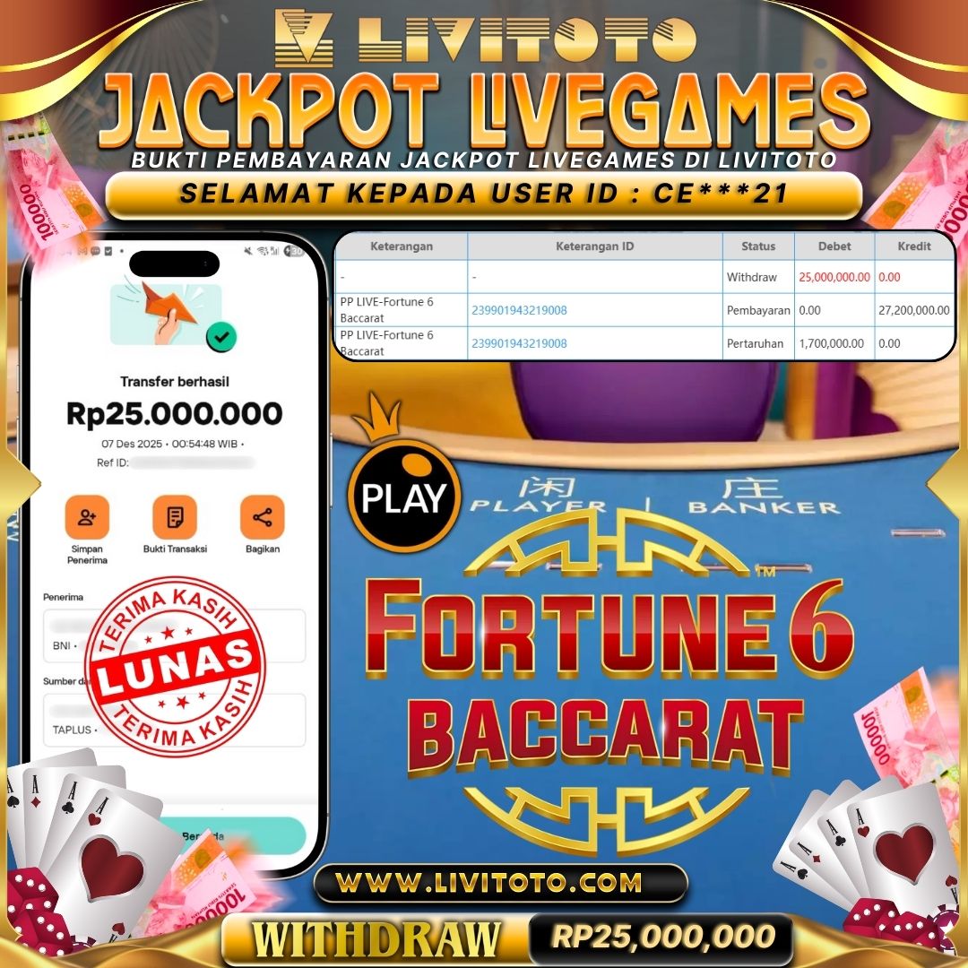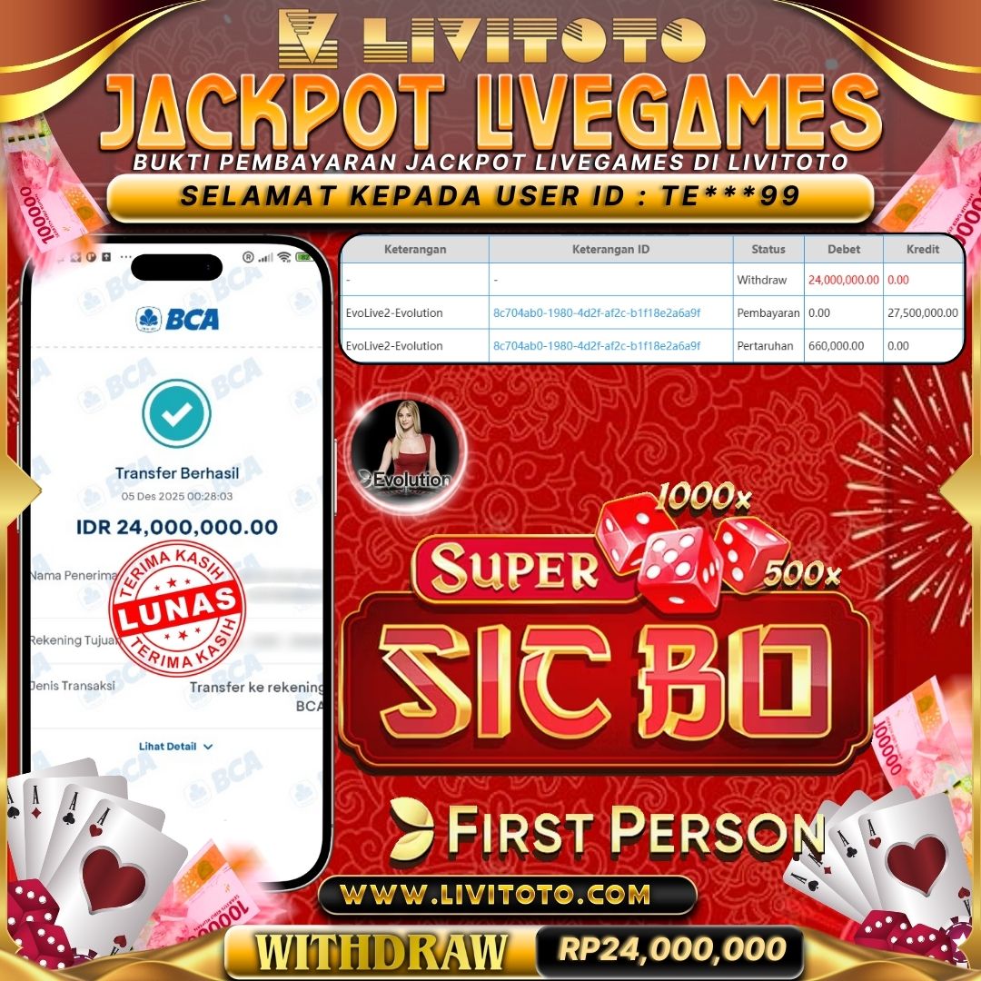 Selamat kepada User id : CH***RA Telah berhasil mendapatkan kemenangan besar pada permainan LIVEGAME kemenangan Sebesar Rp 25,050,000,- Untuk proses withdraw membutuhkan waktu 3-5 menit setelah member mengisi formulir withdraw Untuk bukti pembayaran yang kami berikan adalah bukti pembayaran yang SAH/VALID Segera bergabung dan bermain di LIVITOTO Kemenangan berapapun pastinya akan kami bayarkan. Kepuasan dan Kenyamanan anda bermain menjadi Tanggung Jawab kami.