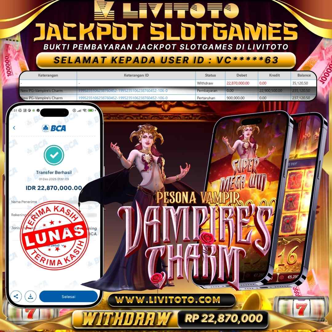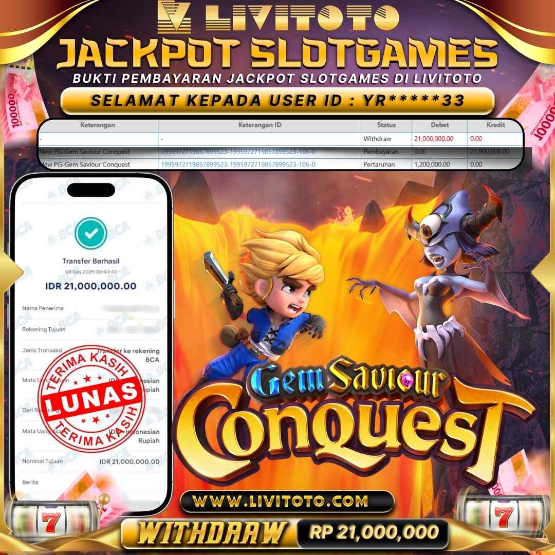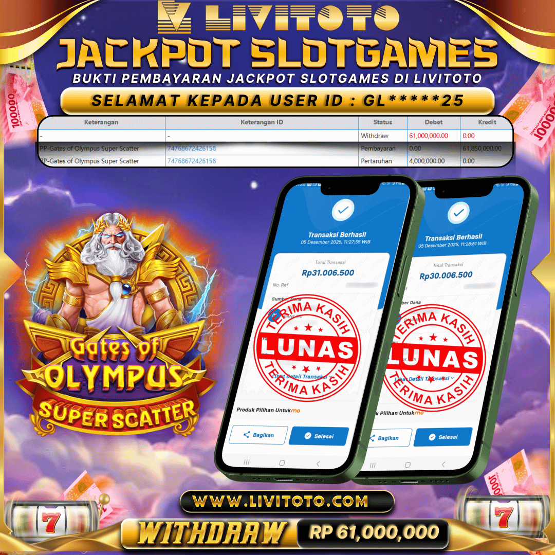 Selamat kepada User id : ND***EE Telah berhasil mendapatkan kemenangan besar pada permainan SLOT kemenangan Sebesar Rp 25,000,000,- Untuk proses withdraw membutuhkan waktu 3-5 menit setelah member mengisi formulir withdraw Untuk bukti pembayaran yang kami berikan adalah bukti pembayaran yang SAH/VALID Segera bergabung dan bermain di LIVITOTO Kemenangan berapapun pastinya akan kami bayarkan. Kepuasan dan Kenyamanan anda bermain menjadi Tanggung Jawab kami.