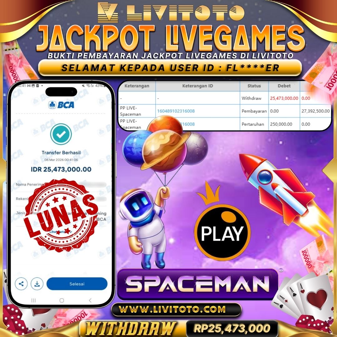 Selamat kepada User id : RAM****A Telah berhasil mendapatkan kemenangan besar pada permainan LIVEGAME kemenangan Sebesar Rp 25,180,000,- Untuk proses withdraw membutuhkan waktu 3-5 menit setelah member mengisi formulir withdraw Untuk bukti pembayaran yang kami berikan adalah bukti pembayaran yang SAH/VALID Segera bergabung dan bermain di LIVITOTO Kemenangan berapapun pastinya akan kami bayarkan. Kepuasan dan Kenyamanan anda bermain menjadi Tanggung Jawab kami.