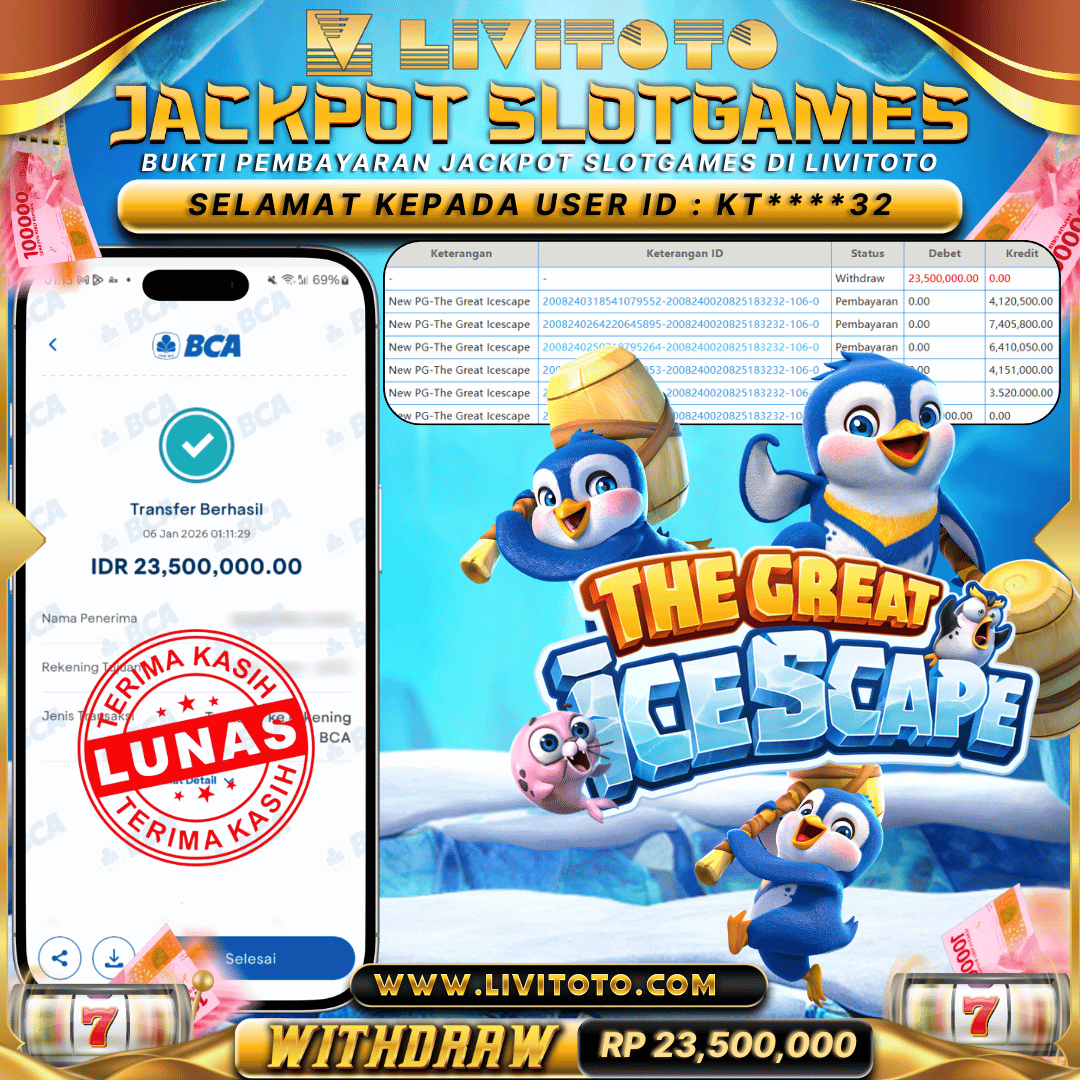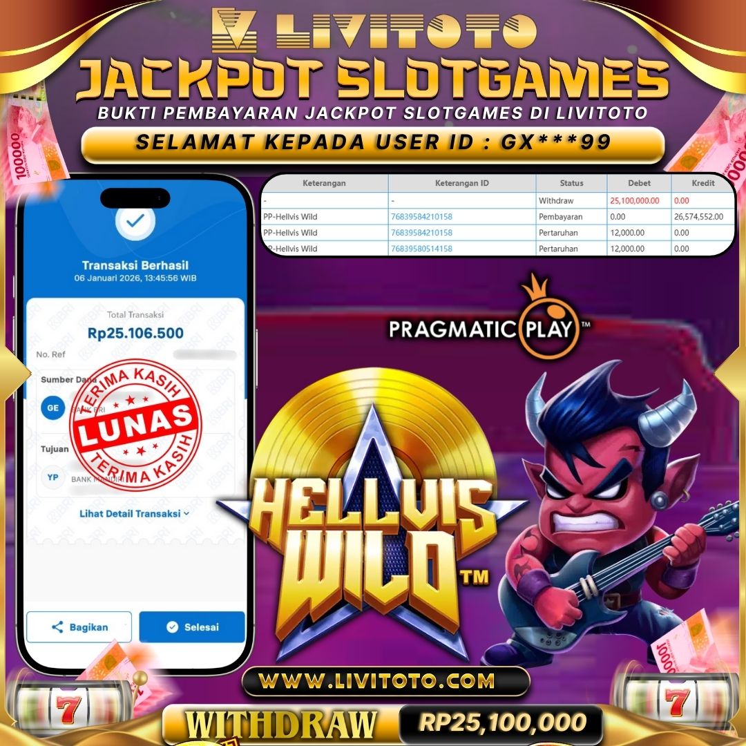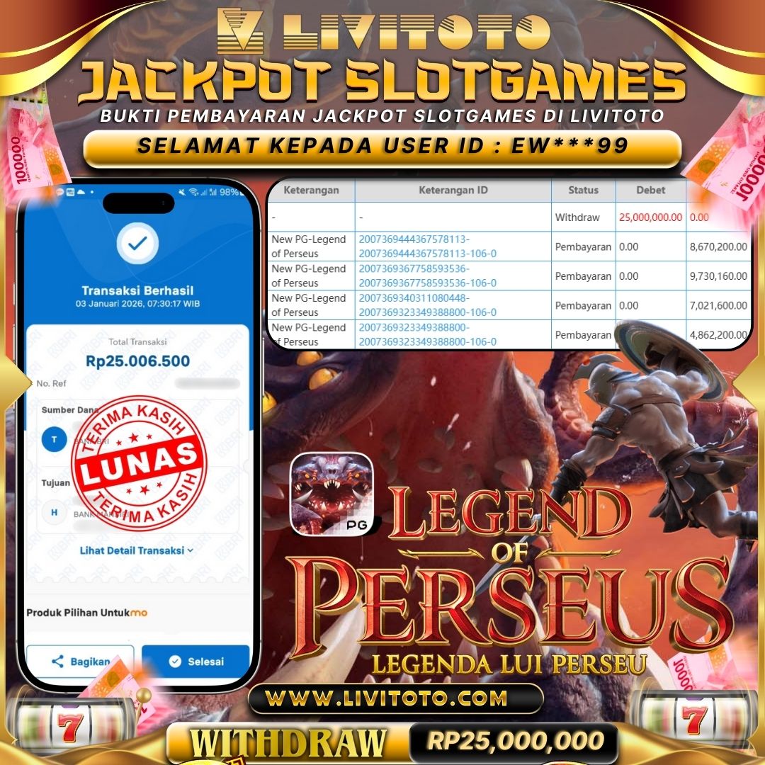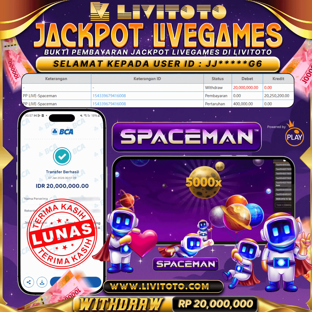 Selamat kepada User id : EW***99 Telah berhasil mendapatkan kemenangan besar pada permainan SLOT kemenangan Sebesar Rp 25,000,000,- Untuk proses withdraw membutuhkan waktu 3-5 menit setelah member mengisi formulir withdraw Untuk bukti pembayaran yang kami berikan adalah bukti pembayaran yang SAH/VALID Segera bergabung dan bermain di LIVITOTO Kemenangan berapapun pastinya akan kami bayarkan. Kepuasan dan Kenyamanan anda bermain menjadi Tanggung Jawab kami.