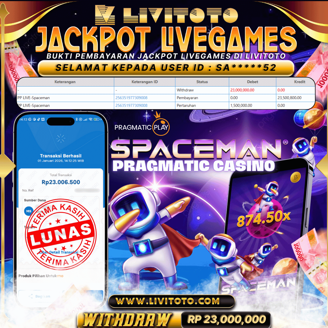 Selamat kepada User id : SA***OP Telah berhasil mendapatkan kemenangan besar pada permainan SLOT kemenangan Sebesar Rp 25,000,000,- Untuk proses withdraw membutuhkan waktu 3-5 menit setelah member mengisi formulir withdraw Untuk bukti pembayaran yang kami berikan adalah bukti pembayaran yang SAH/VALID Segera bergabung dan bermain di LIVITOTO Kemenangan berapapun pastinya akan kami bayarkan. Kepuasan dan Kenyamanan anda bermain menjadi Tanggung Jawab kami.