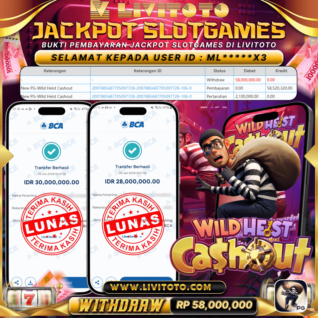 Selamat kepada User id : ML*****X3 Telah berhasil mendapatkan kemenangan besar pada permainan SLOT kemenangan Sebesar Rp 58,000,000,- Untuk proses withdraw membutuhkan waktu 3-5 menit setelah member mengisi formulir withdraw Untuk bukti pembayaran yang kami berikan adalah bukti pembayaran yang SAH/VALID Segera bergabung dan bermain di LIVITOTO Kemenangan berapapun pastinya akan kami bayarkan. Kepuasan dan Kenyamanan anda bermain menjadi Tanggung Jawab kami.