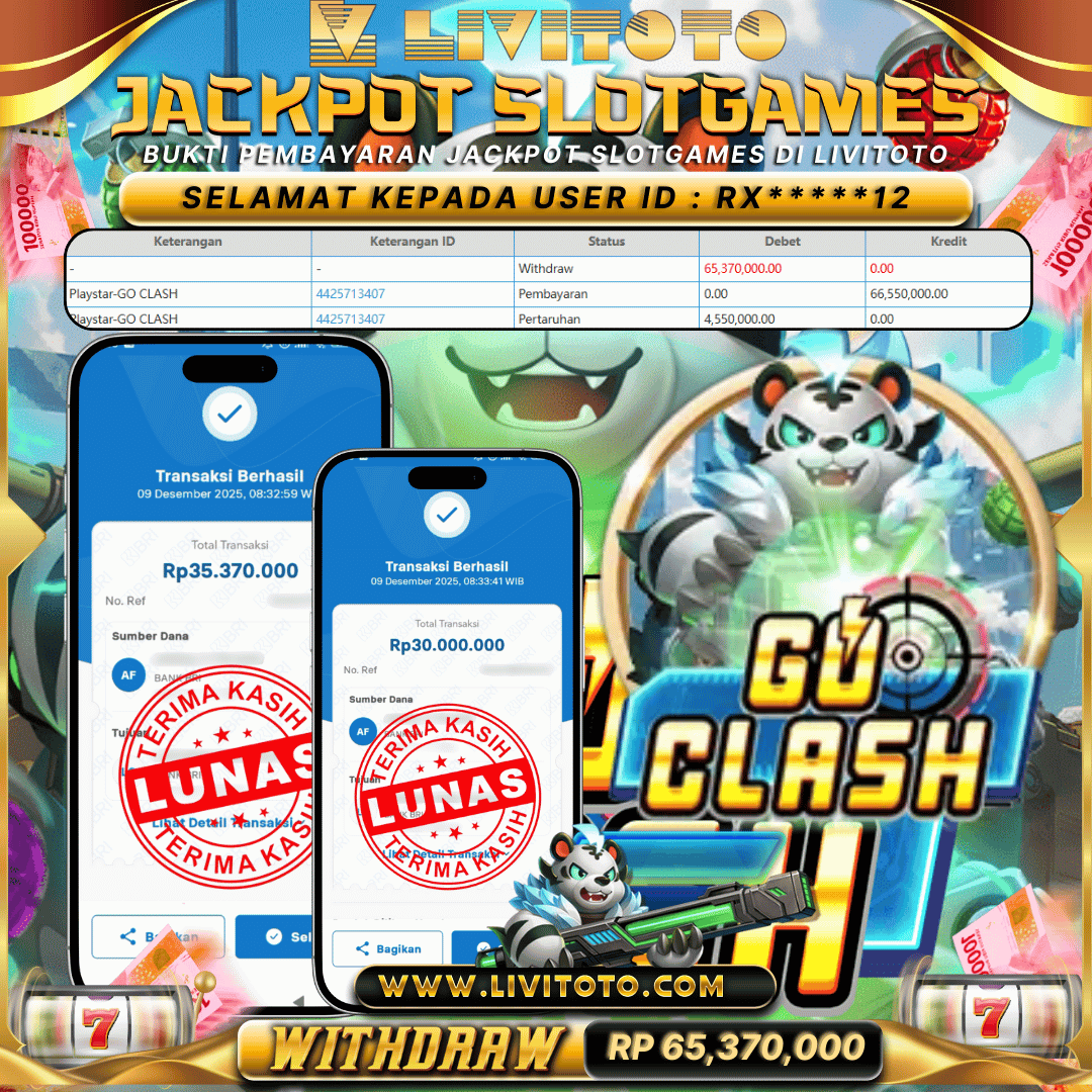 Selamat kepada User id : RX*****12 Telah berhasil mendapatkan kemenangan besar pada permainan SLOT kemenangan Sebesar Rp 65,370,000,- Untuk proses withdraw membutuhkan waktu 3-5 menit setelah member mengisi formulir withdraw Untuk bukti pembayaran yang kami berikan adalah bukti pembayaran yang SAH/VALID Segera bergabung dan bermain di LIVITOTO Kemenangan berapapun pastinya akan kami bayarkan. Kepuasan dan Kenyamanan anda bermain menjadi Tanggung Jawab kami